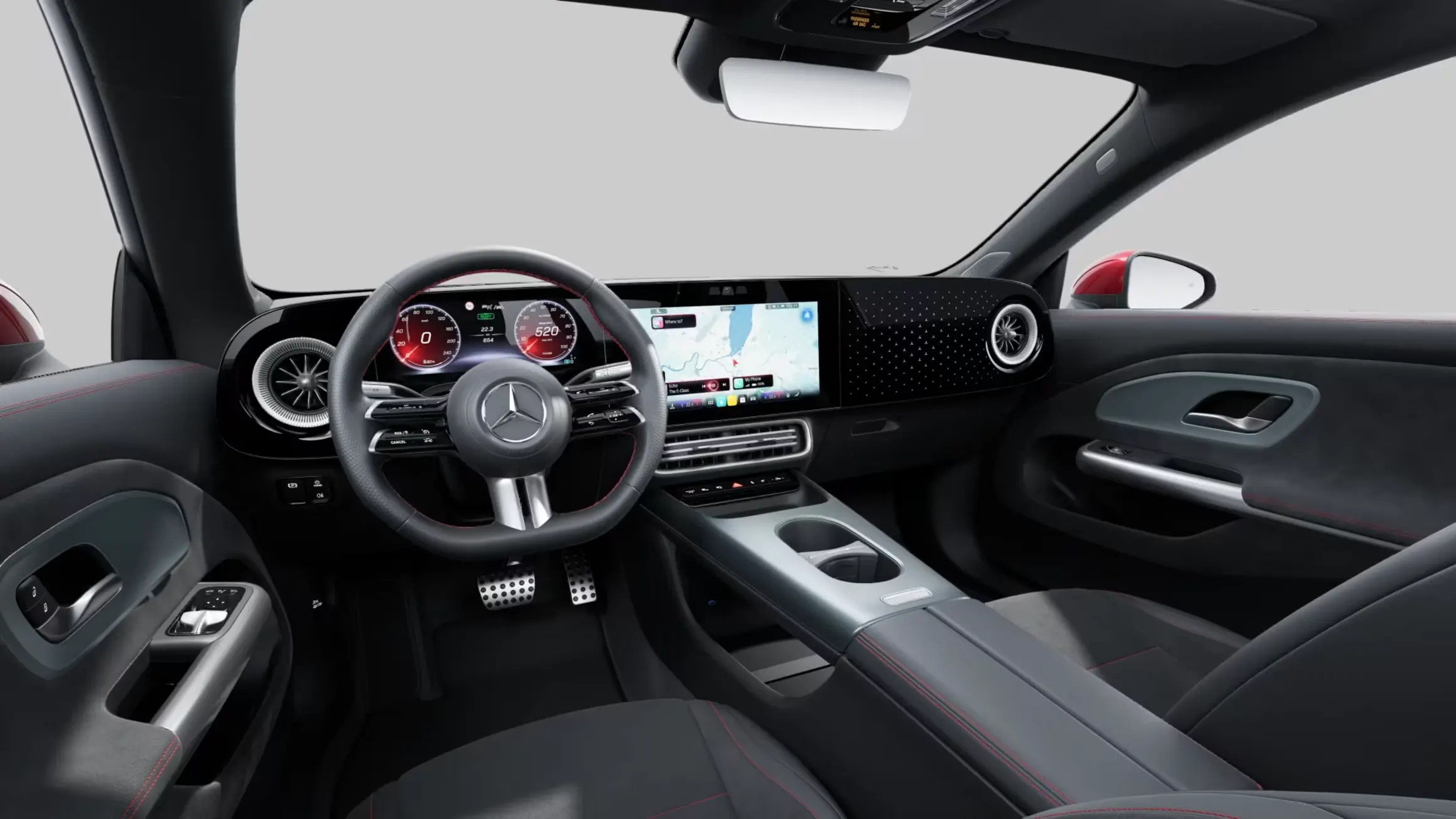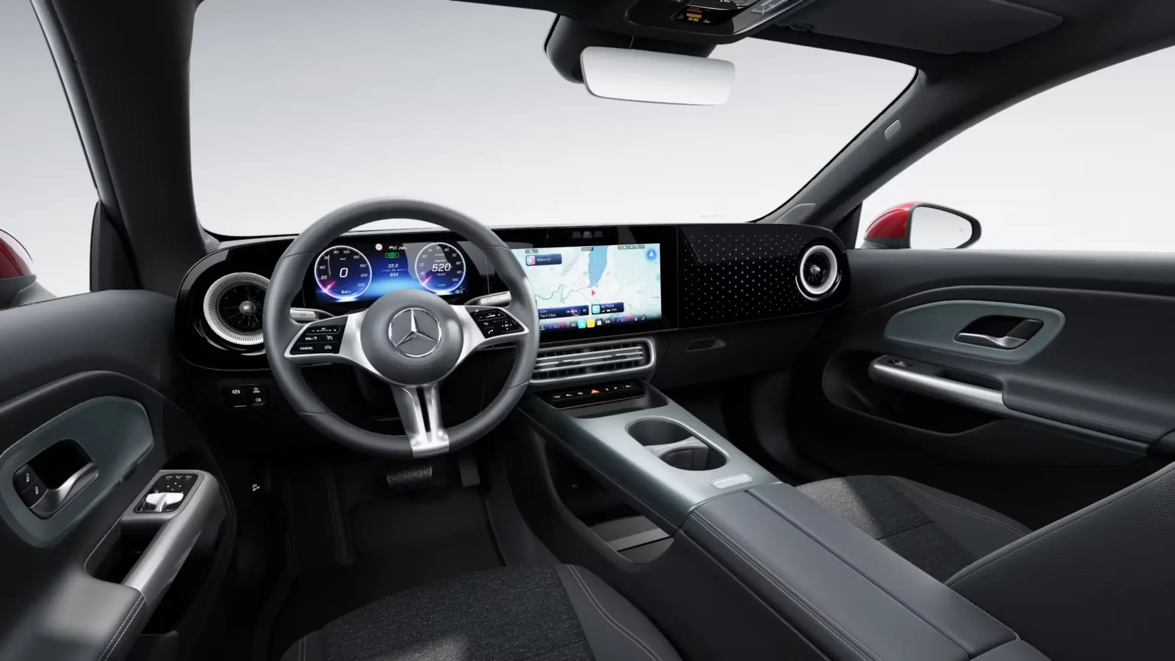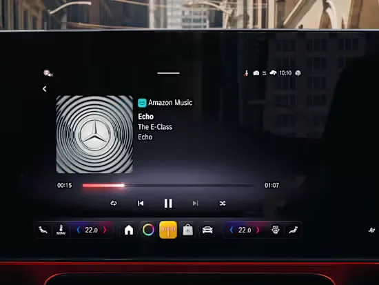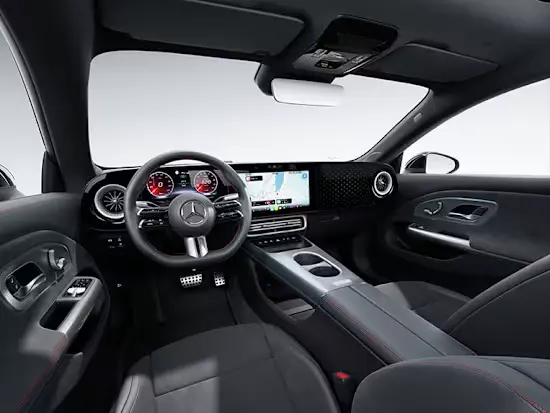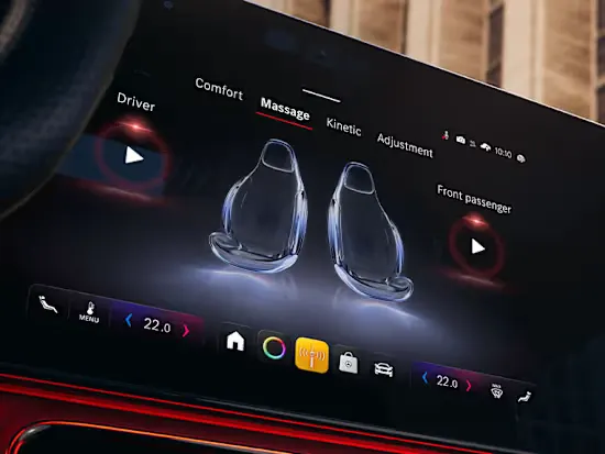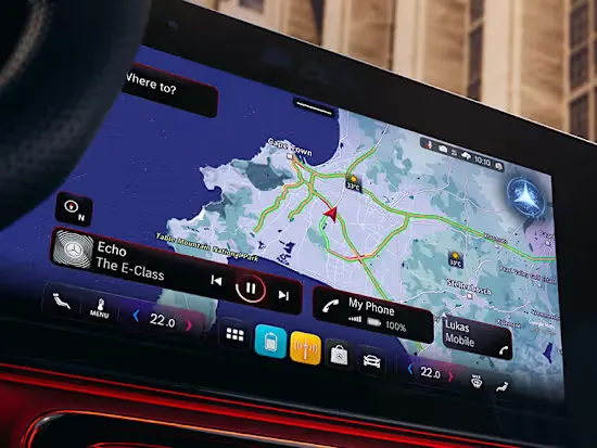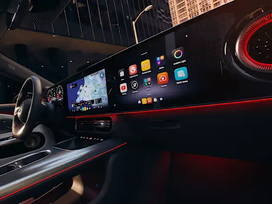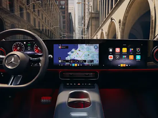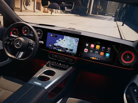 Головний акцент інтер’єру — мультимедійна панель MBUX Superscreen[1], що розтягується на всю ширину передньої панелі. Вона поєднує три екрани в єдину інтерактивну систему, де як водій, так і пасажир отримують доступ до застосунків Mercedes-Benz та сервісів сторонніх розробників. Вся важлива інформація відображається інтуїтивно й одразу.