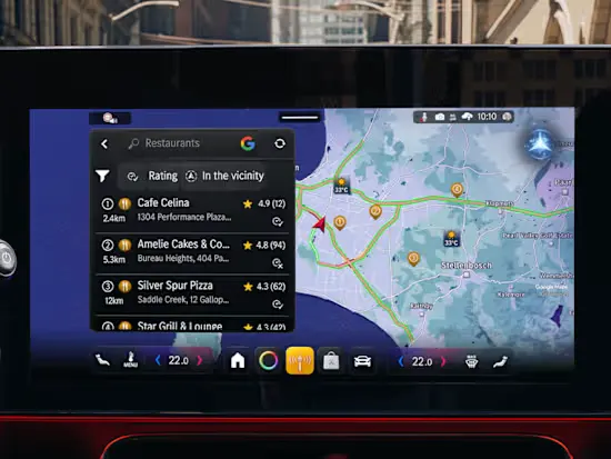 Інтеграція Google Maps дозволяє отримувати рекомендації щодо маршрутів, актуальні дані про трафік і цікаві місця, залишаючи при цьому фірмовий інтерфейс Mercedes-Benz.